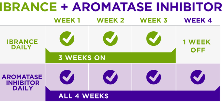 - IBRANCE and an aromatase inhibitor are taken orally in a 4-week cycle as a once-daily dose. For the first 3 weeks (21 days), you’ll take one IBRANCE and one aromatase inhibitor pill, once a day. Then for the last week (7 days), you’ll take only one pill, once a day—an aromatase inhibitor. At the end of 4 weeks, the cycle will start over again. Your healthcare team will monitor your therapy throughout.