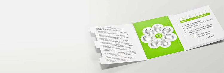 The packaging features a clear and simple design with helpful information on how to take once-daily IBRANCE throughout the 3-weeks on, 1-week off treatment schedule. Tablets must be kept in the pack until it is time to take them. Your monthly box will contain 3 individual weekly packs. Each pack contains 7 IBRANCE tablets. Watch the video below to learn more.
